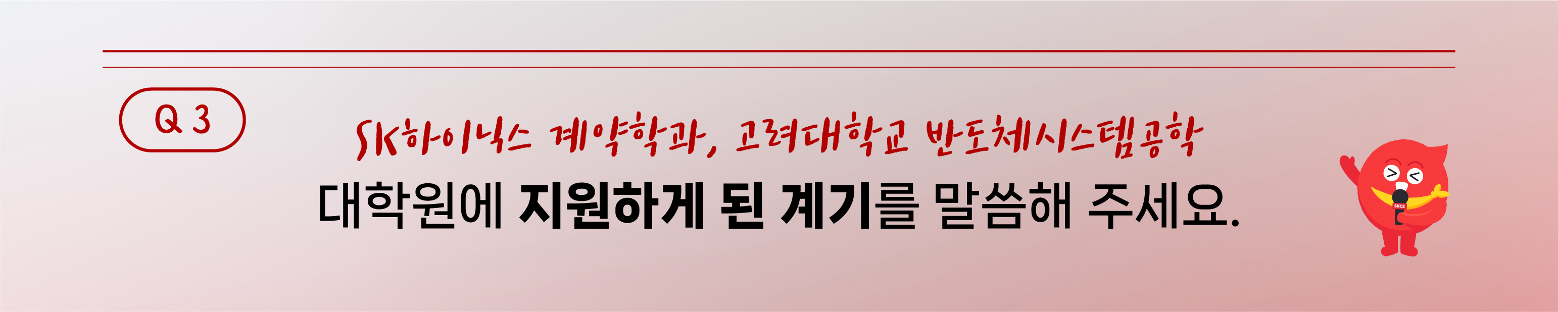 그러던 중 고려대학교 반도체시스템공학과를 알게 되었고, 석사과정을 통해 저의 강점을 만들고 공부하는 것에 아쉬움을 남기고 싶지 않아졌습니다. 계약학과에 진학한다면 SK 하이닉스에 취업까지 할 수 있다는 점에서, 용기를 내서 지원하게 되었습니다.