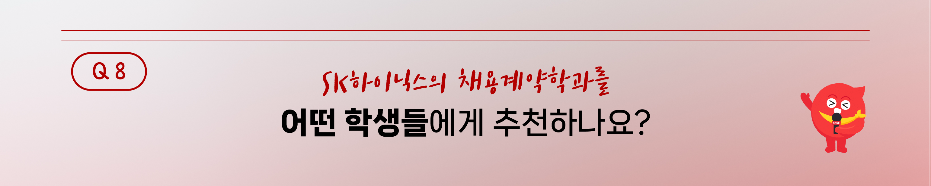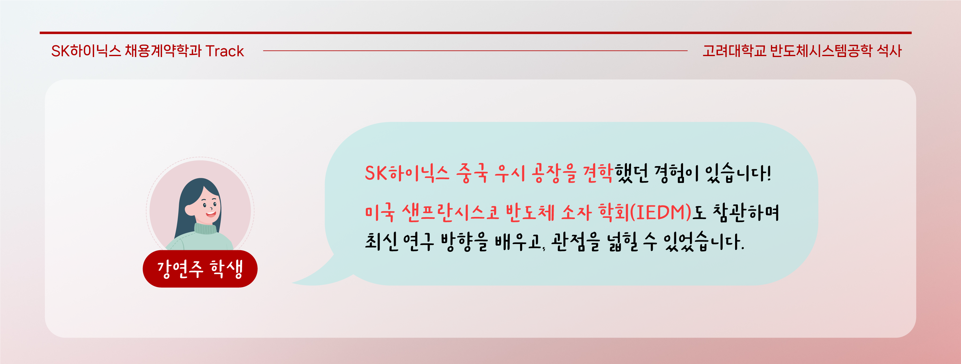 강연주학생:고려대학교반도체시스템공학과는 SK하이닉스의채용계약학과입니다. 졸업 후 SK하이닉스 취업이 보장되고, 학비 및 학비 보조금을 지원받을 수 있는 장점이 있습니다. 이외에도 해외저명학회참관지원, SK하이닉스연구소견학, 연구용개인노트북지원등많은 혜택을 받을 수 있습니다.