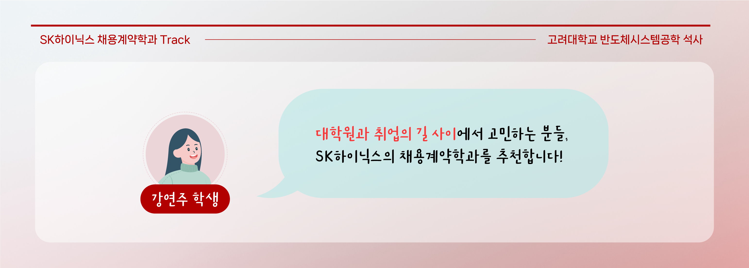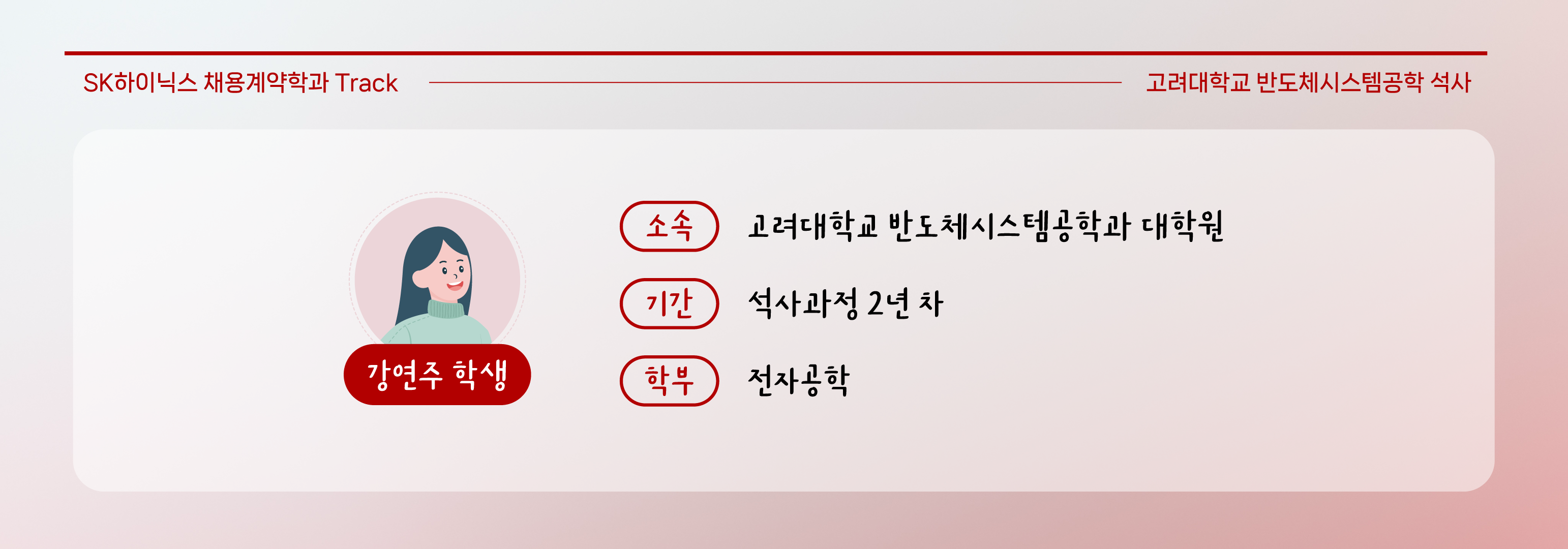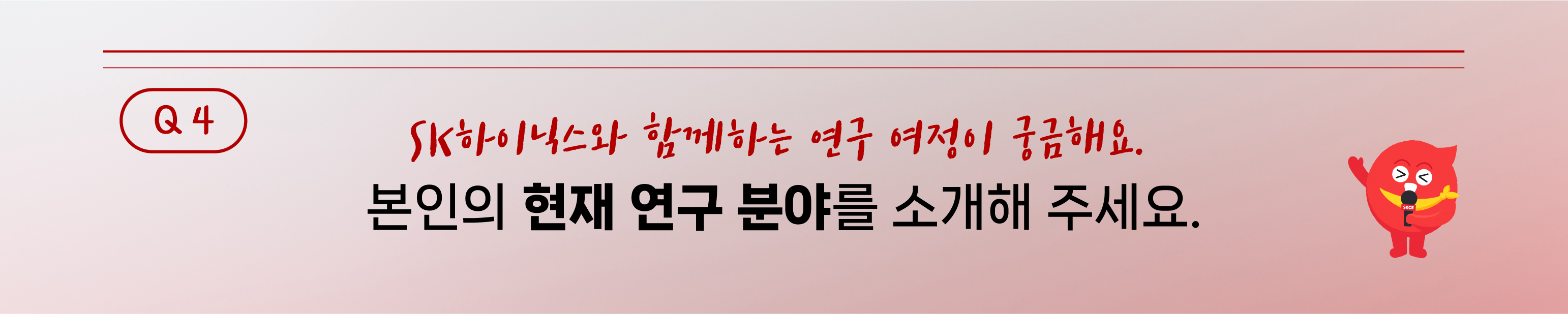 강연주 학생:대학원 진학과 취업을 고민하는 학부생분들께 이 기회를 적극 추천해 드리고 싶습니다. SK하이닉스의 지원을 받으며 석사과정 동안 본인만의 강점을 만들고, 연구 능력을 기를 수 있는 경험에 꼭 도전해 보세요!