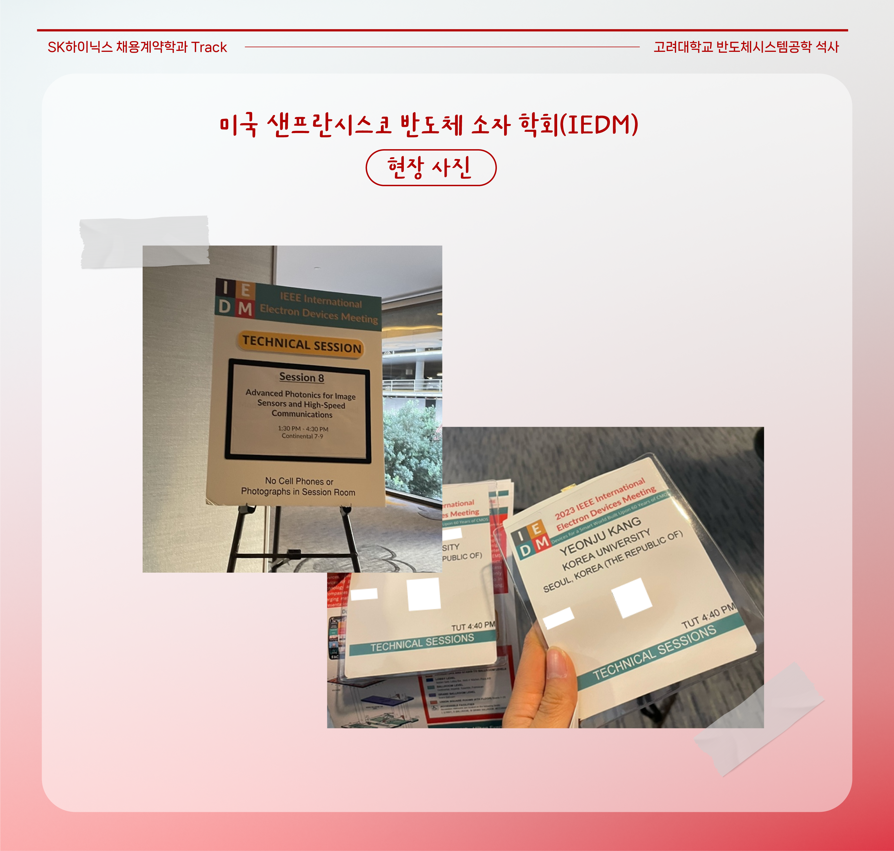 강연주 학생: 다른 산학장학생 지원 혜택으로는 해외 저명 학회 참여 기회가 있습니다. 저 또한 미국 샌프란시스코 반도체 소자 학회 IEDM에 참관한 경험이 있습니다. 학회에서 반도체 소자 분야의 연구 동향에 대한 강연을 들을 수 있었고, 최신 연구 방향에 대해 배울 수 있는 계기가 되었습니다. 또한 발표 이후 연구에 대해 제시된 다양한 질문과 의문점을 통해, 더 넓은 관점으로 연구 내용을 경험하고 이해할 수 있었습니다.