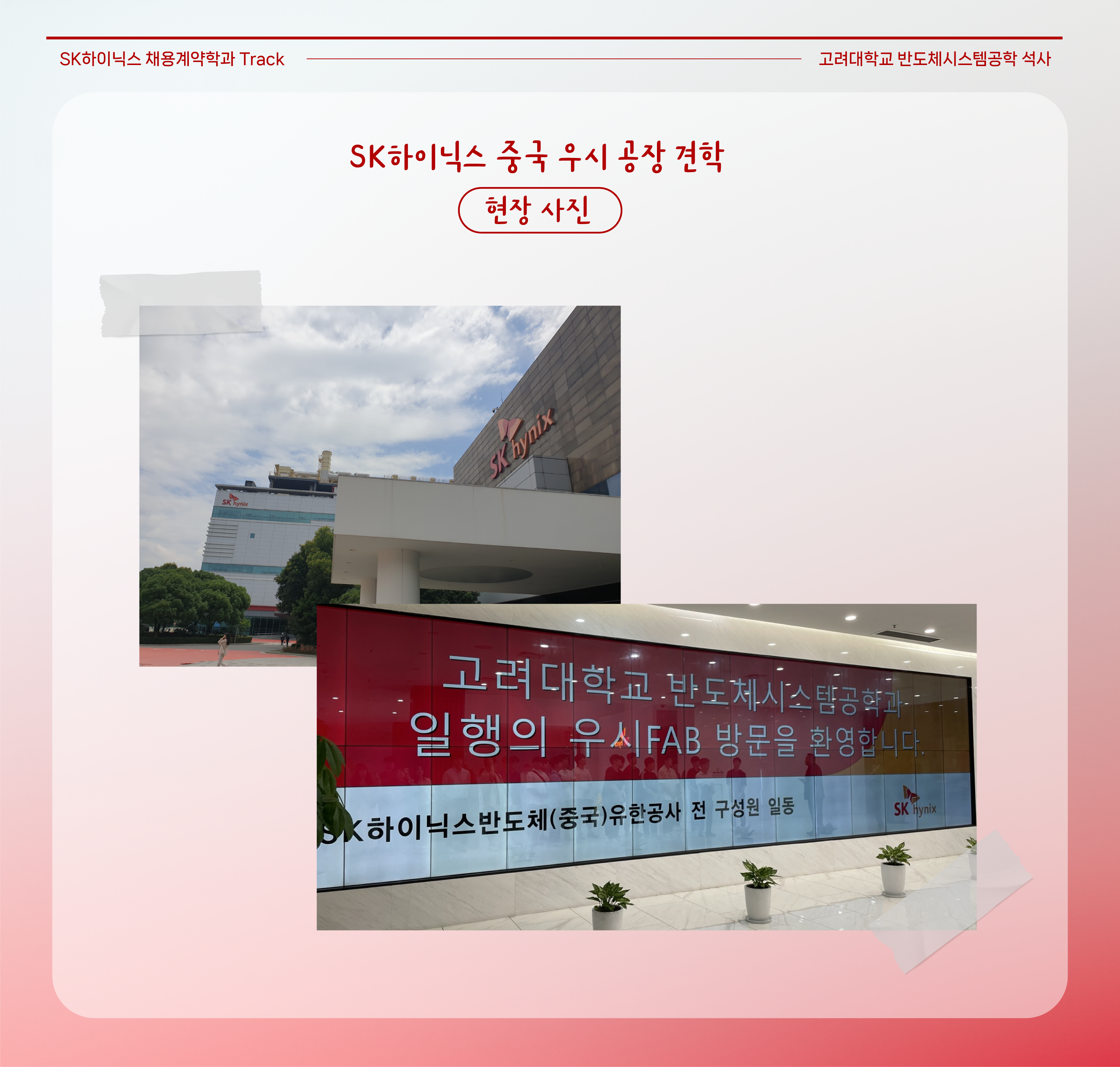 강연주 학생: 공장 견학 경험은 반도체 산업을 더 가까이에서 배울 수 있었던 기회였습니다. 견학 일정 동안 SK하이닉스에서 제공해 준 식사와 숙소로 편하게 머물 수 있었으며, 이외에도 우시나 상해를 관광하는 시간을 가졌습니다. 함께 참여한 고려대학교 반도체시스템공학과 대학원생분들과 함께 즐거운 시간을 보낼 수 있어 좋았습니다!