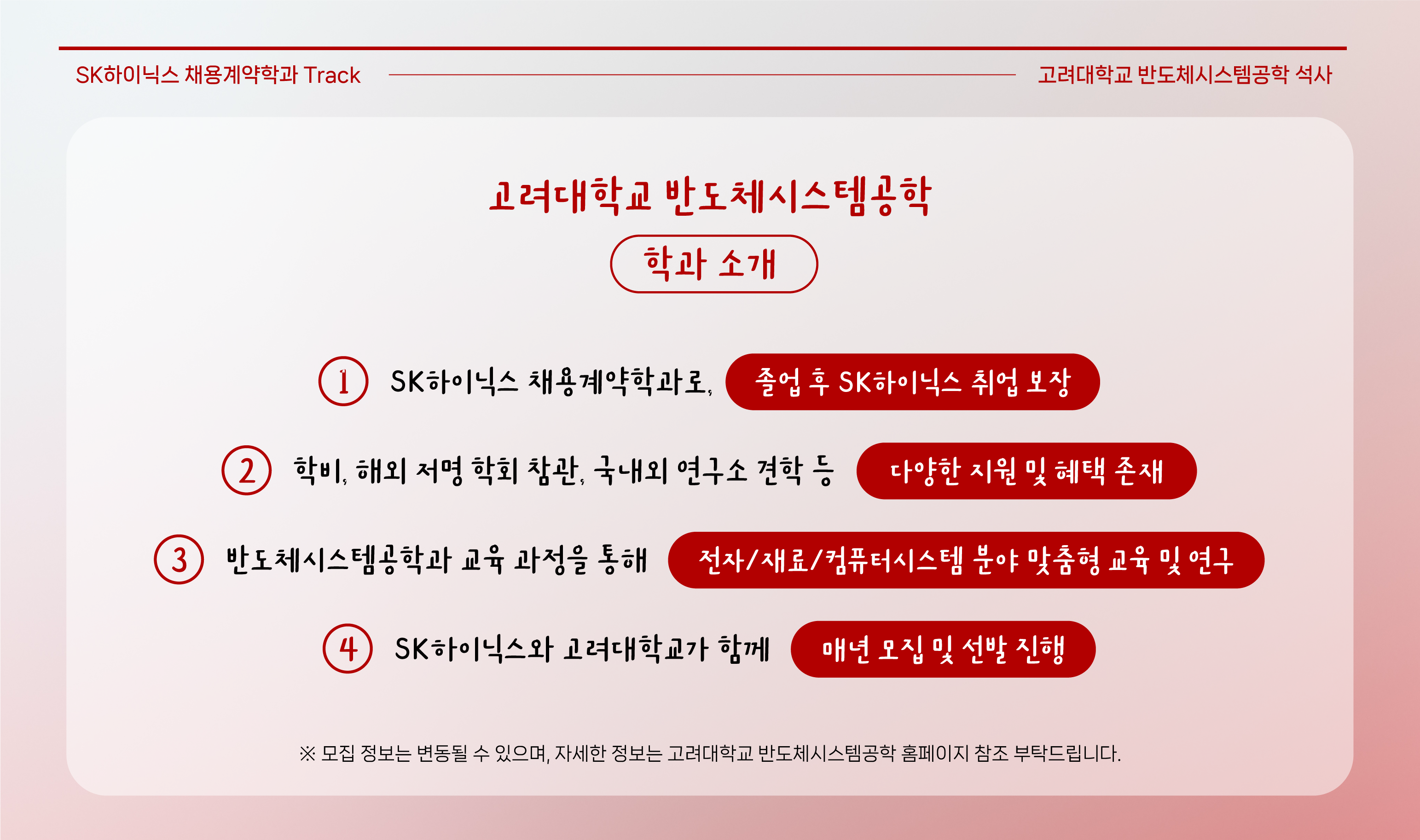 모집 전형에 있어서, SK하이닉스와 고려대학교가 함께 매년 모집 및 선발을 진행합니다. 입시에 관한 자세한 과정은 고려대학교 반도체시스템공학과 홈페이지를 참고할 수 있고, 고려대학교에서 진행하는 입시설명회에서 추가적인 정보를 얻을 수 있습니다!