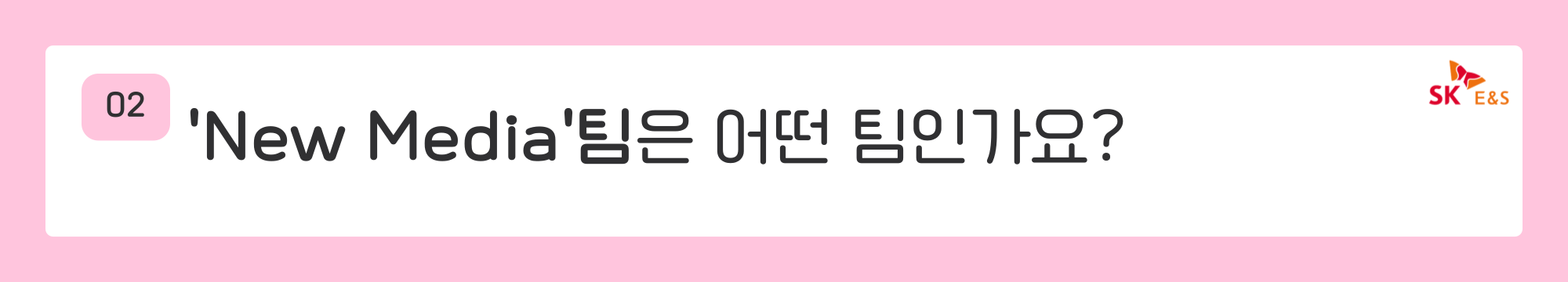 명제규 매니저:안녕하세요! 저는 SK E&S New Media팀에서 근무하고 있는 명제규 매니저입니다. 이전에는 LNG 관련 업무를 했었고, New Media팀으로 넘어온 지는 약 3년 정도 되었습니다. 사내방송, 인스타그램 등을 담당하고 있습니다.