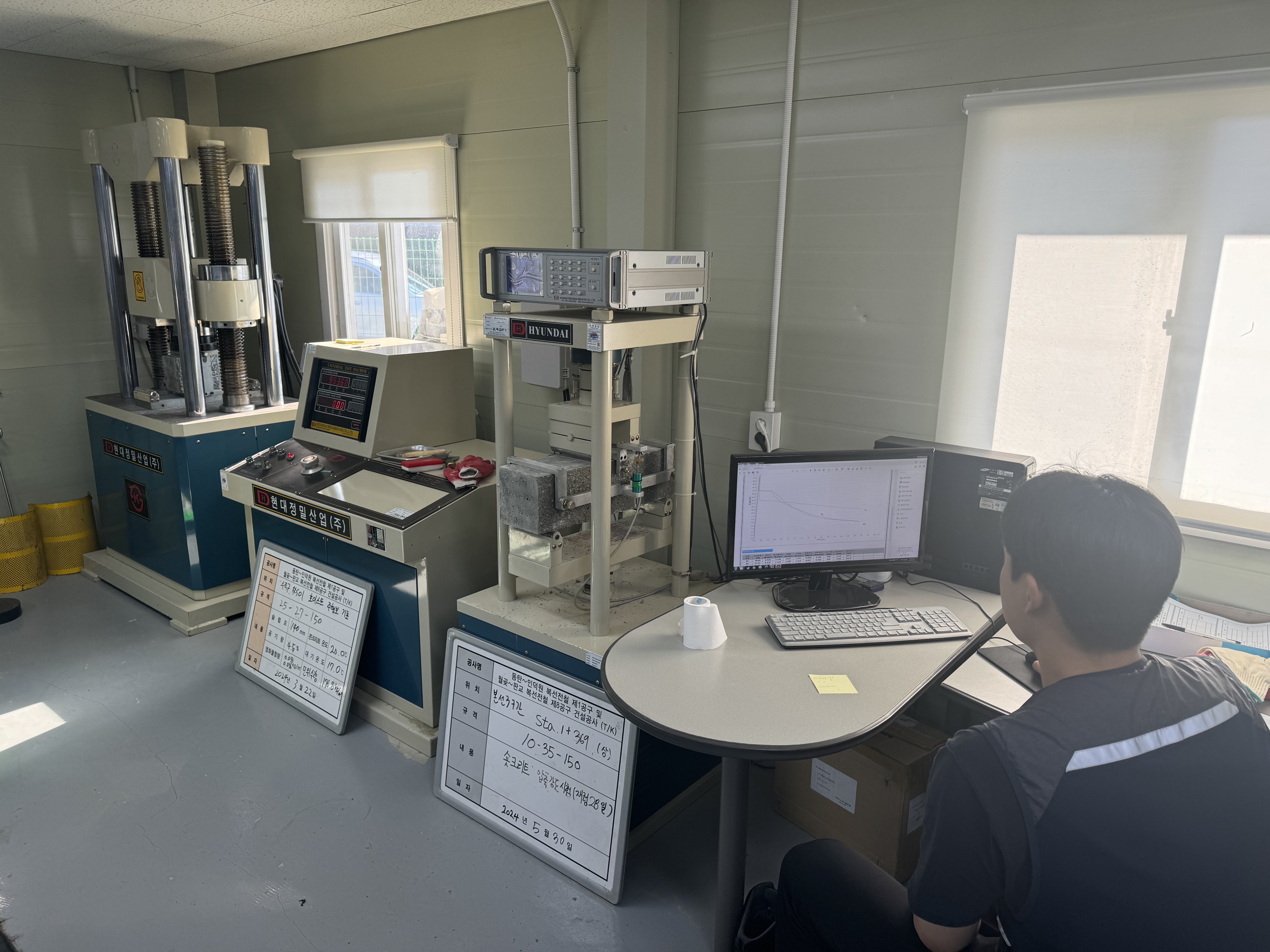숏크리트 물성 시험(좌), 숏크리트 휨 성능, 압축 강도 시험(우) (한주형 프로님 제공)