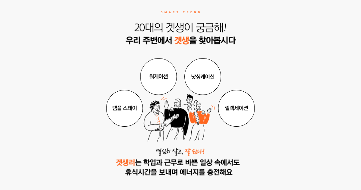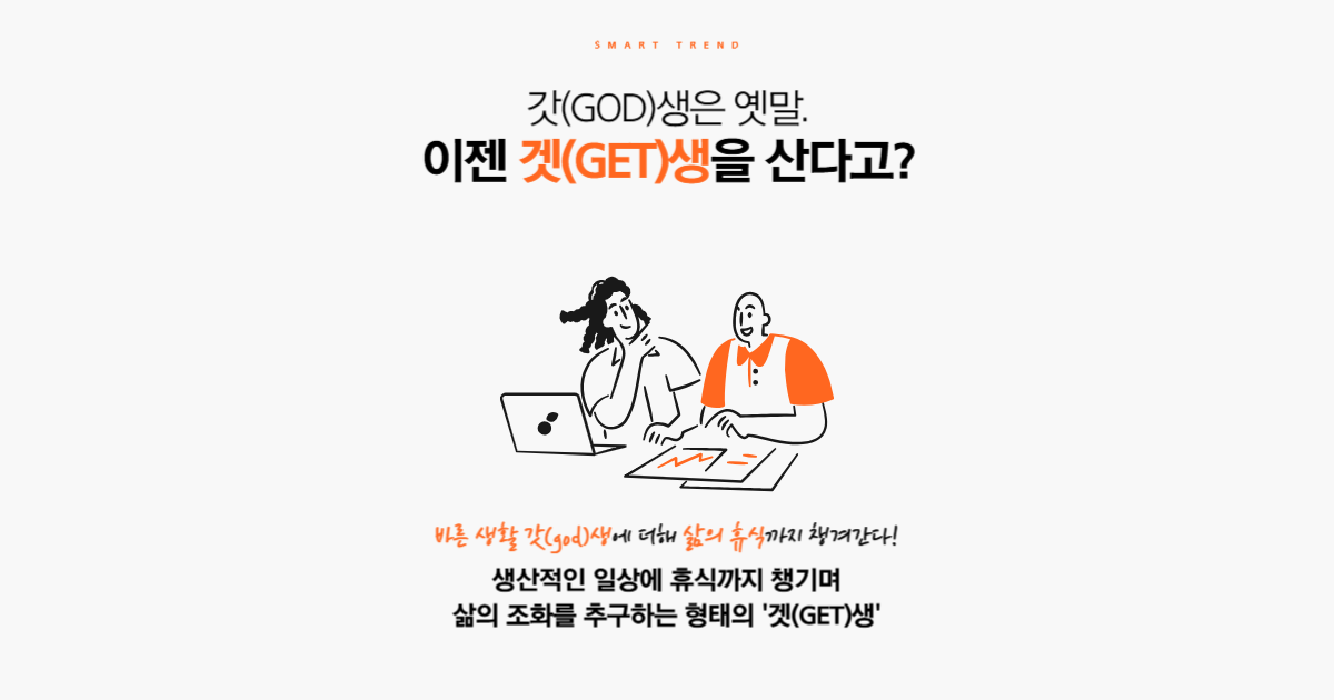이번 스마트 트렌드에서는 겟생에 대해 알아보고, 어떤 형태로 겟생을 즐길 수 있는지 그 형태를 소개하고자 합니다. 누구보다 잘 놀고 잘 쉬고 싶은 분들은 끝까지 집중해 주세요!
