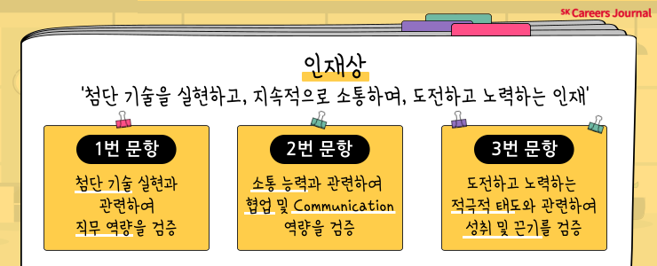 SK하이닉스의 인재상은 '첨단 기술을 실현하고, 지속적으로 소통하며, 도전하고 노력하는 인재'인데요, 첨단 기술 실현과 관련해서는 직무 역량을 검증할 수 있는 1번 문항, 소통 능력과 관련해서는 협업 및 Communication 역량을 검증할 수 있는 2번 문항, 마지막으로 도전하고 노력하는 적극적 태도와 관련해서는 성취 및 끈기를 검증할 수 있는 3번 문항으로 이어진다고 보시면 됩니다.