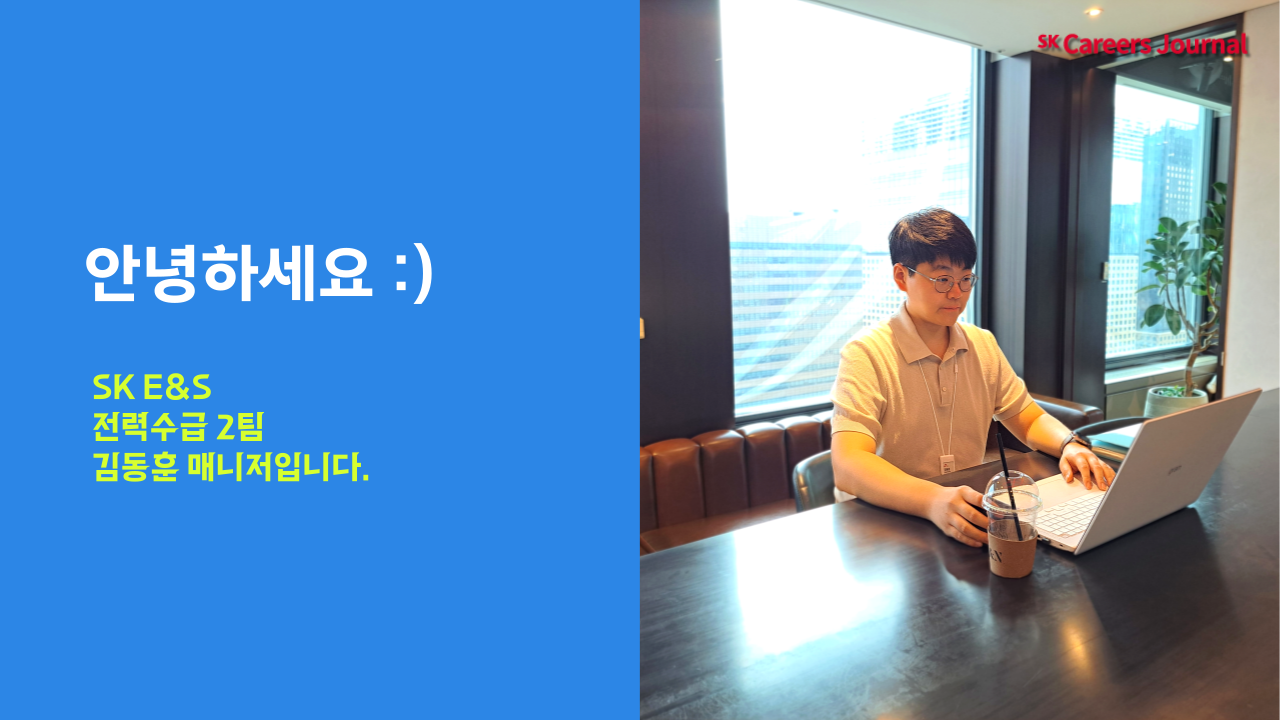 안녕하세요 SK E&S 전력수급 2팀 김동훈 매니저입니다. 17년도 초에 입사해서 현재는 8년 차 매니저로 근무하고 있습니다. 입사 후 6년 동안은 전력사업개발 업무를 담당해 왔고, 작년 초에 전력 운영 본부로 이동해서 현재는 전력수급 업무를 수행하고 있습니다.