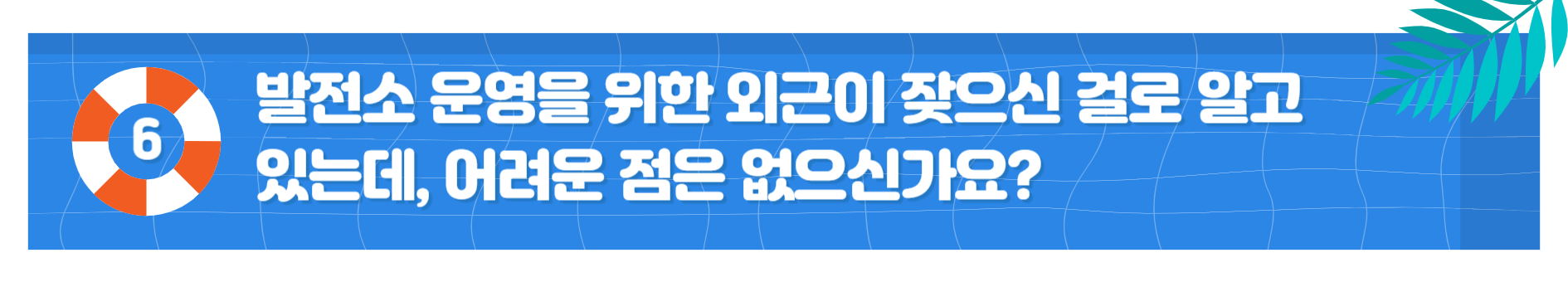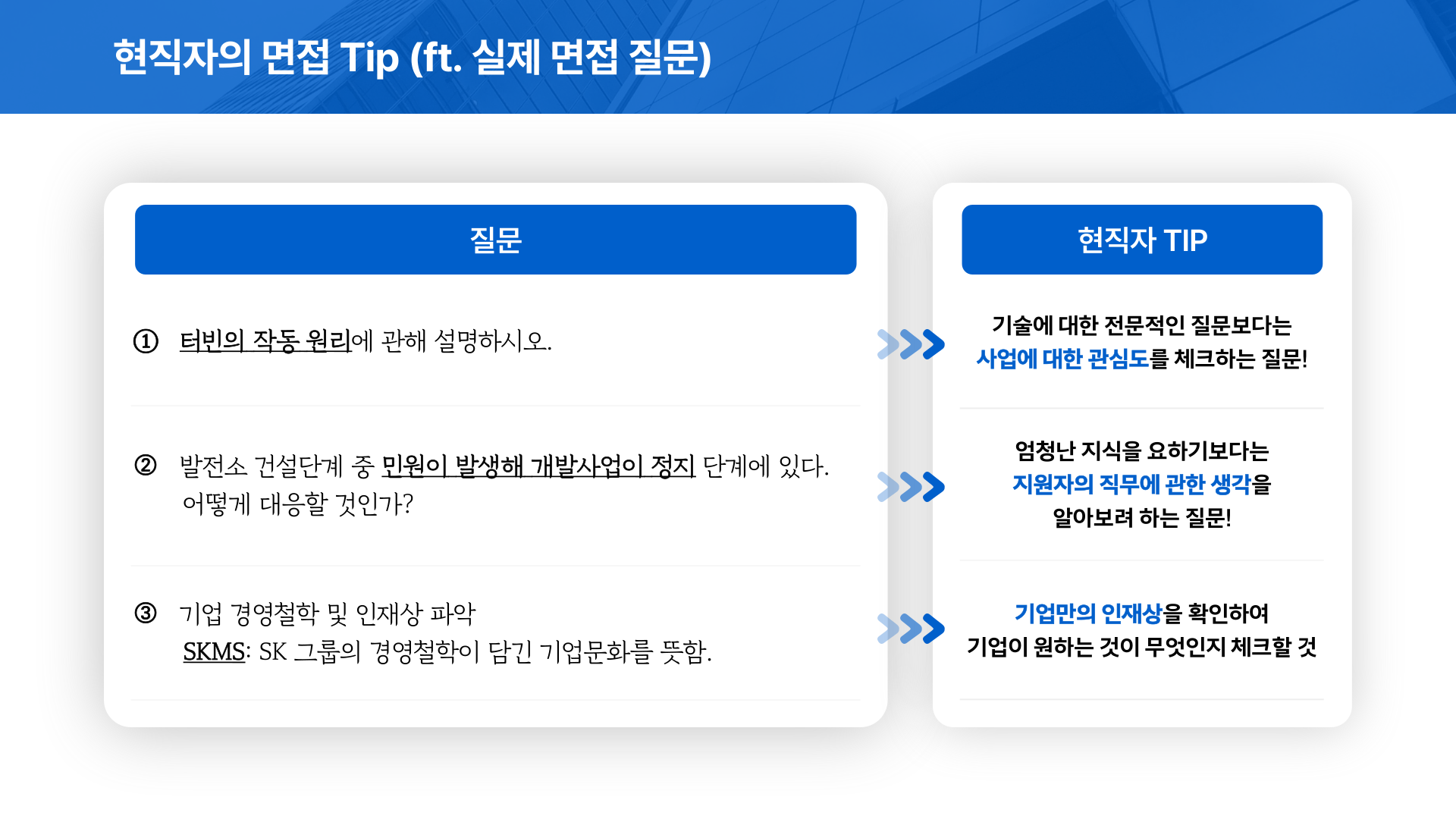 특별한 역량보다도, 이 분야에 관심을 많이 가진 지원자라면 눈이 갈 거 같아요. 에너지 업종, 특히 발전 업종은 많이 알려져 있지 않잖아요. 관심을 가지고 본 사람과 안 가지고 본 사람과의 차이가 다른 곳보다 크게 나는 분야거든요.