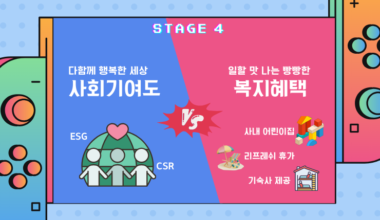 네 번째 스테이지는 사회적 기여도 vs 복지제도입니다.
