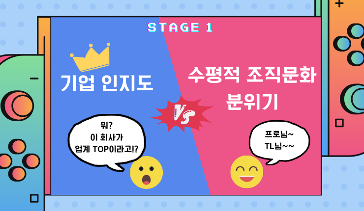 첫 번째 스테이지는 기업 인지도 vs 수평적인 조직문화 및 분위기입니다.