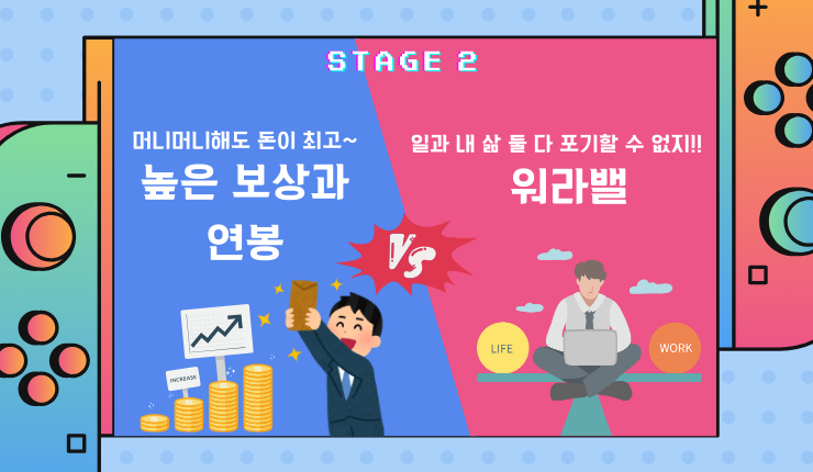 두 번째 스테이지는 경제적 보상&높은 연봉 vs 워라밸입니다.