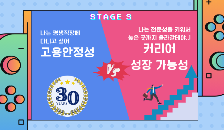 세 번째 스테이지는 고용안정성 vs 커리어 성장 가능성입니다.