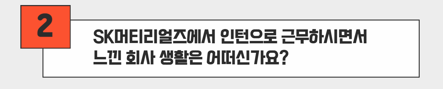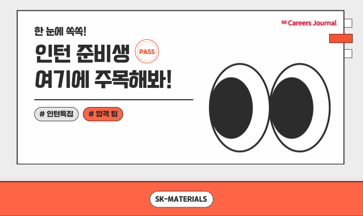 안녕하세요! SK머티리얼즈 취재기자 이지혜입니다.😊 SK머티리얼즈의 채용 및 직무 관련한 정보들을 마구마구 전달하는 [슼-정보통]으로 찾아뵙게 되었습니다. 첫 번째 편은 사회 초년생, 대학생들의 경력 사항 한 줄이 될 수 있는 [인턴 특집]입니다. 유익한 정보를 제공하기 위해, 경영관리담당의 심수민PL님과 HR지원담당의 박준우PL님과 이야기하는 시간을 가졌습니다.