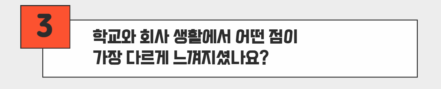 박준우PL님:회사 생활에서는 더더욱 타인과 소통하고 협업을 통해 부족한 점을 보완하고더 나은 결과를 창출할 수 있어야 합니다. 학교생활은 혼자서 할 수 있지만 회사 생활은 혼자서 할 수 없다는 것이 가장 큰 차이점인 것 같습니다.