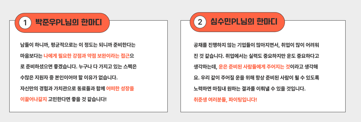 박준우PL님:자신에 대한 명확한 인지를 위한 성찰이 가장 중요하다고 생각합니다. 많은 지원자가 대외 활동, 자격증의 횟수, 어학 점수와 같은 취업의 왕도를 찾고자 하는데, 저는 그러한 것들이 오히려 타 지원자와의 차이점을 없게 만든다 생각합니다. 이에 그치지 않고, 지금까지의 삶을 되돌아보며 무엇을 잘하는지, 나만의 특색과 가치관은 무엇인지 등을 명확히 한다면 준비 과정에서 큰 어려움이 없을 것으로 생각합니다. 저도 마찬가지로 명확한 가치관을 가지고 자신감 있고 솔직하게 전형들에 임했던 것이 좋은 기회를 얻는 데 큰 도움이 되지 않았나 싶습니다.