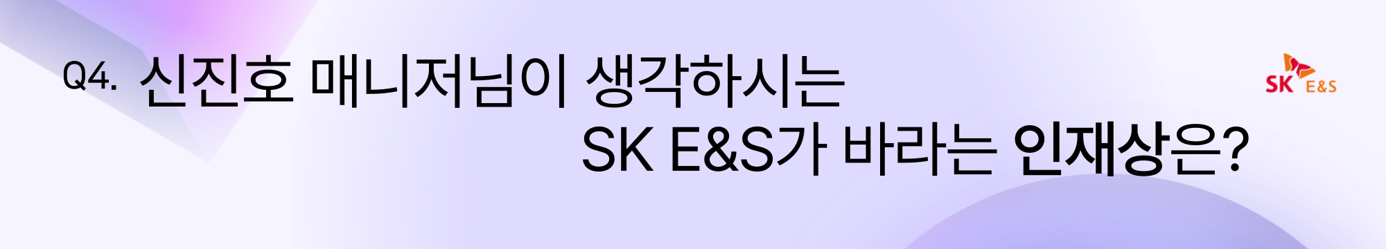 신진호 매니저: 안녕하세요! 저는 SK E&S Talent Management팀에서 채용과 구성원의 이동 등을 담당하고 있는 신진호 매니저라고 합니다. 쉽게 말해서 SK E&S에 입사 시, 무조건 저희 팀 거쳐서 입사하게 된다고 생각해 주시면 될 것 같습니다.