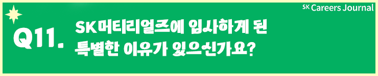 제가 이직을 결심했을 때 크게 3가지를 놓고 도전해보자고 생각을 했었습니다. 첫 번째는 미래 유망한 사업을 갖추고 있고, 두 번째는 회사가 지속적으로성장을 하고 있고, 세 번째는 저 역시 커리어적으로 크게 성장할 수 있는 회사였는데 그 시기에 정말 운이 좋게 3가지를 모두 완벽하게 충족하는 SK주식회사 머티리얼즈가 저를 필요하다고 여겼고 만족스럽게 회사 생활을 이어가고 있습니다