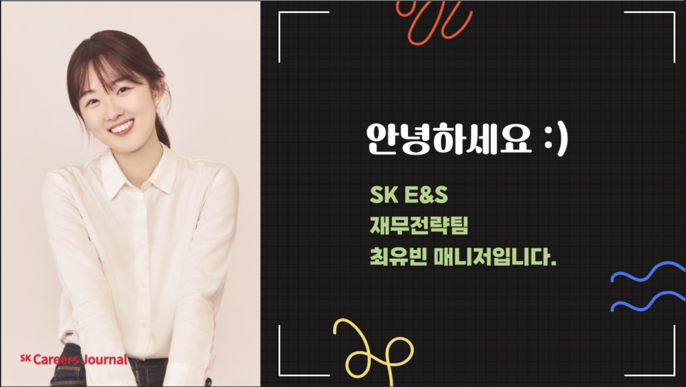 안녕하세요, 저는 SK E&S 재무전략팀에 재직 중인 최유빈 매니저라고 합니다. 23년 1월 입사하여 2년 차를 향해 달려가고 있는 중입니다. 요즘 자기소개 필수 요소인 MBTI는 ISFJ입니다. (ㅎㅎ)