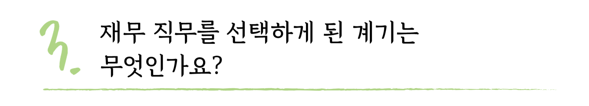재무 관련 공부를 시작하고 ‘이거다!’라는 생각이 들었던 것 같아요. 재무는 어느 정도의 지식 베이스가 필요하기 때문에 꾸준히 공부하다 보면 전문성을 갖출 수 있는 분야라고 생각했고, 정적인 업무를 좋아하는 제 성격과도 잘 맞는다고 느꼈습니다. 그러다 보니 재무 직무로 정함에 있어 망설임이 없이 선택하게 되었던 것 같습니다.