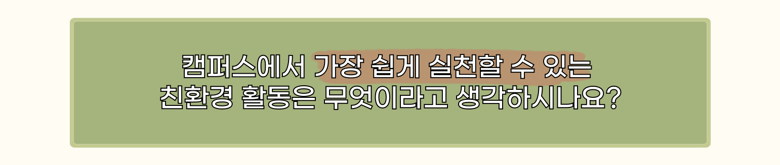 - ♻️: 캠퍼스라면… 재활용 캠페인을 진행하는 것이 좋다고 생각해요. 캠퍼스 내에서 쓰레기 분리배출을 장려하는 포스터를 만들거나, 정기적으로 재활용 관련 이벤트를 개최하면 많은 학생들이 참여할 수 있을 것 같아요. 이렇게 하면 재활용의 중요성을 알리고, 실천할 수 있는 기회를 제공할 수 있다는 생각이 드네요.
