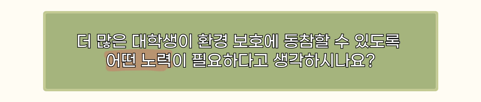 - ♻️: 학생들이 환경 보호를 실제로 경험할 수 있는 기회를 제공하는 것이 중요하다고 생각해요. 예를 들어 캠퍼스 내에서 정기적으로 나무 심기나 플로깅과 같은 체험형 활동을 마련해 주면 더 많은 학생들이 직접 참여하고 환경 보호의 중요성을 느낄 수 있을 거라고 생각합니다.