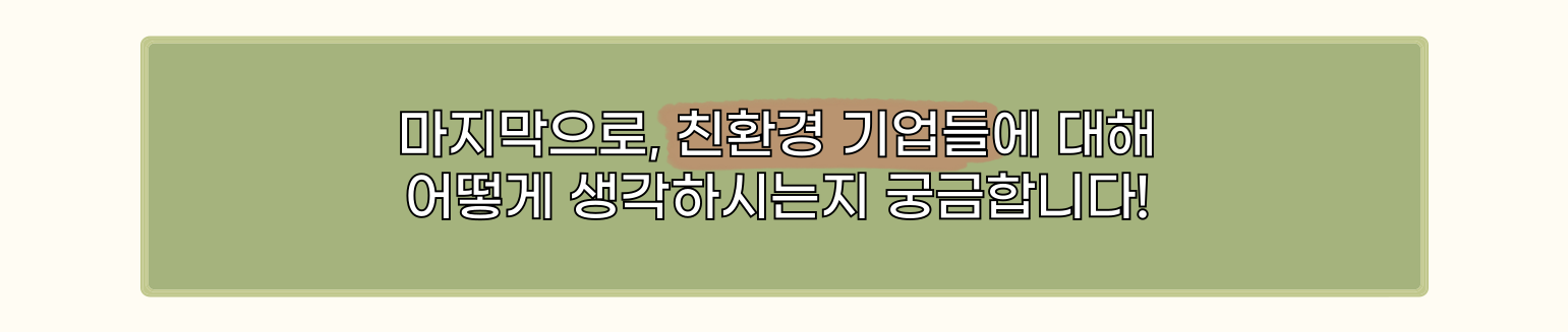 - 🌏: 저는 친환경 기업들이 사회적 책임을 다하고 있다고 생각해요. 환경 보호를 위해 기업이 제품이나 운영 방식을 변화시키는 것은 쉬운 일이 아니지만, 이를 통해 더 지속 가능한 미래를 만들어가는 데 기여하고 있으니까요. 특히, 재생 가능한 에너지를 사용하거나, 폐기물을 줄이는 등 실질적인 변화를 보여주는 기업들은 정말 긍정적으로 보고 있는 편입니다.