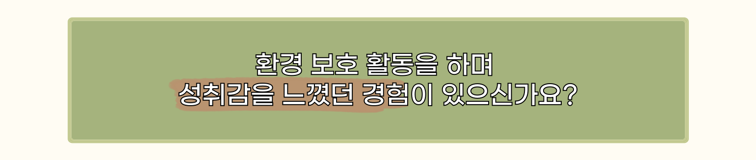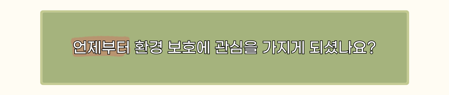 - 🌳: 대학교 1학년 때 환경 동아리에 가입하면서 관심이 커졌어요. 그때부터 작은 행동이 모이면 큰 변화를 일으킬 수 있다는 걸 느꼈죠.