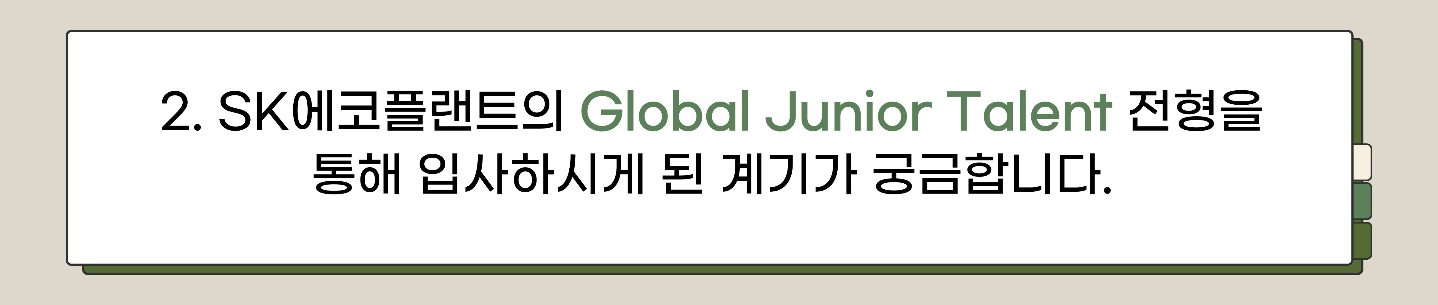 - 대학원 시절부터 환경 사업에 관심이 많았지만, 전공이 환경과는 관련이 없어서 처음에는 환경 관련 회사에 지원하는 것이 자신이 없었습니다. 그러던 중, 제 관심을 알고 있던 친구가 SK에코플랜트의 Global Junior Talent 채용 공고를 발견하고, 전공이 다르더라도 한번 도전해 보자며 저를 설득했습니다. 공고를 확인해 보니, 마침 제가 정말 하고 싶었던 직무와 잘 맞아 지원하게 되었습니다.