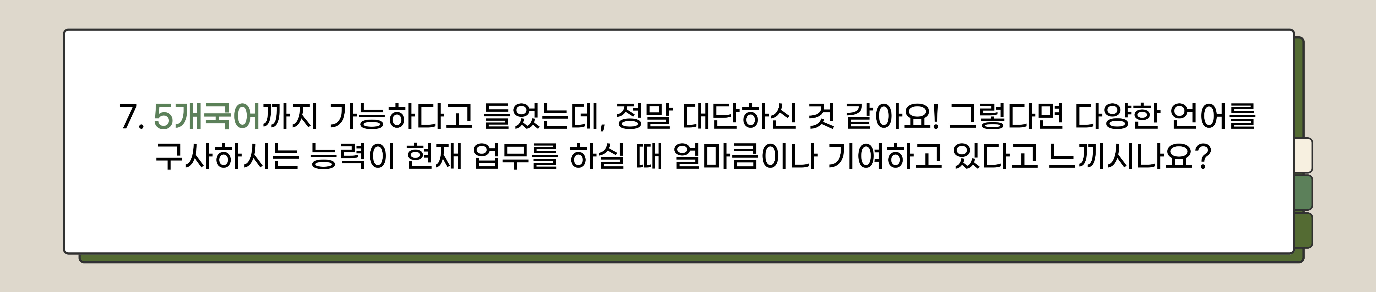 - 다양한 언어를 구사할 수 있는 능력은 해외 업무에서 원활한 커뮤니케이션과 문화적 차이를 이해하는 데 큰 도움이 된다고 생각합니다. 5개 언어 중에선 특히 영어를 제일 많이 활용하는 것 같아요. 업무시간의 80%를 영어 자료를 읽고, 영어로 커뮤니케이션을 하는 데 사용하고 있습니다. 언어 구사 능력에 있어 팁을 드리자면 자격증을 취득하는 것도 중요하지만, 실무에서 활용 가능할 만큼 언어 사용을 익숙하게 만드는 게 좋을 것 같아요. 언어를 연습할 수 있는 환경을 자발적으로 마련하는 것이 더 큰 도움이 된다는 거죠. 특정 언어 자격증이 있더라도 그 언어를 일상적으로 꾸준히 사용해야 언어 능력과 감각을 유지할 수 있다고 생각합니다.
