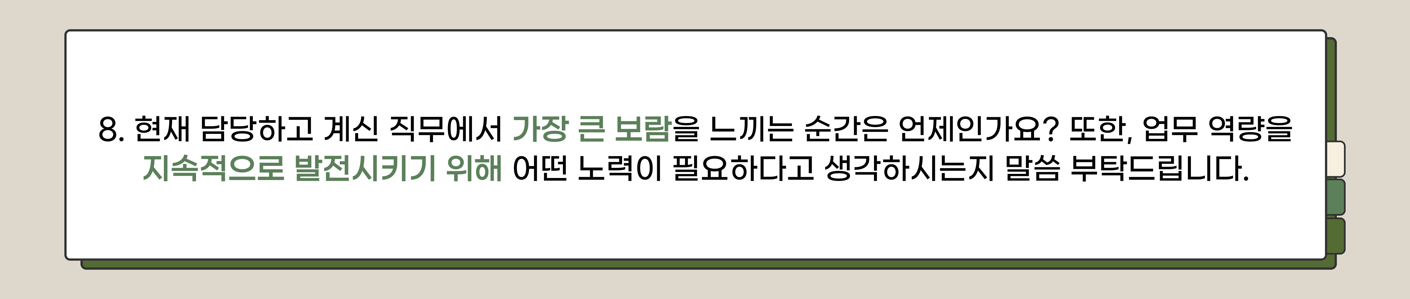 - 해보지 않은 일에 도전해 완수할 때 가장 큰 보람을 느낍니다. 새로운 과제나 업무를 성공적으로 마무리했을 때의 성취감은 저에게 매우 큰 힘이 됩니다. 업무 역량을 지속해서 성장시키기 위해서는 꾸준히 배우려는 자세가 필요하다고 생각합니다. 주어진 업무를 최대한으로 배우고, 새로운 지식과 기술을 지속적으로 습득하며, 그 경험을 통해 계속 발전하는 것이 중요하다고 봅니다.