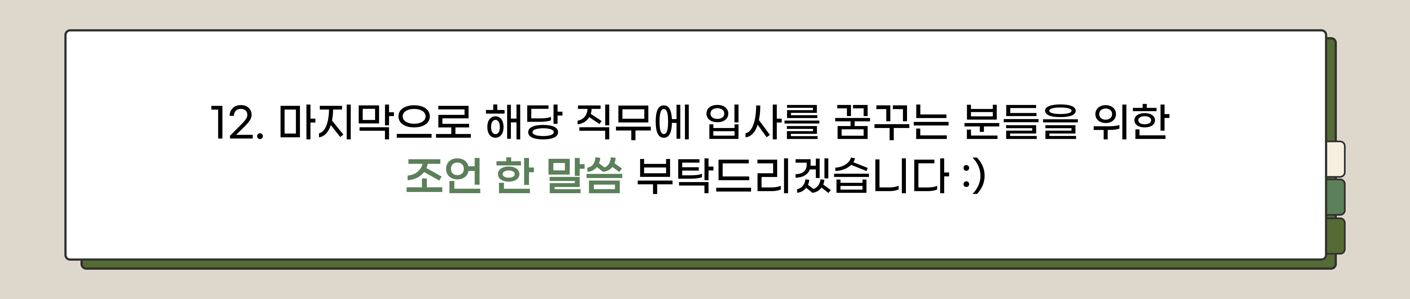 - 입사하기 전에 다양한 경험을 쌓는 것을 추천해 드립니다. 유학, 워킹홀리데이 등 여러 해외 경험이 직장 생활에 많은 도움이 될 것입니다. 공부에만 집중하기보다는 활동과 경험을 통해 얻은 교훈이 자기소개서 작성이나 면접에서 더 큰 가치를 발휘할 수 있다고 생각합니다. 저도 자기소개서를 작성할 때 동아리 활동이나 해외 경험 등을 통해 얻은 경험을 강조한 덕분에 인터뷰 당시 많은 관심을 받을 수 있었습니다. 대학생 시절에 가능한 모든 경험을 즐기신 후, 후회 없는 준비를 하시길 바랍니다!