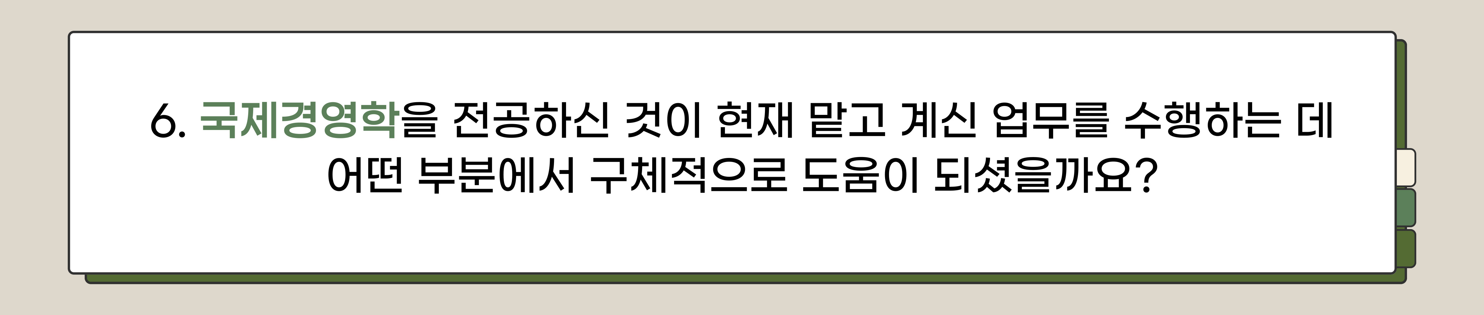 - 국제경영학을 전공해서 해외사업 관리 업무를 수행하기가 훨씬 수월한 것 같아요. 국제경영학은 단순히 경영만 배우는 것이 아니라, 다양한 국가의 문화, 언어, 그리고 경제 상황까지 폭넓게 연구할 수 있는 학문인데요. 이와 같은 배경지식은 해외 자회사를 관리하고, 다양한 문화와 경제적 상황을 이해하는 데 큰 도움이 되고 있다고 생각합니다.