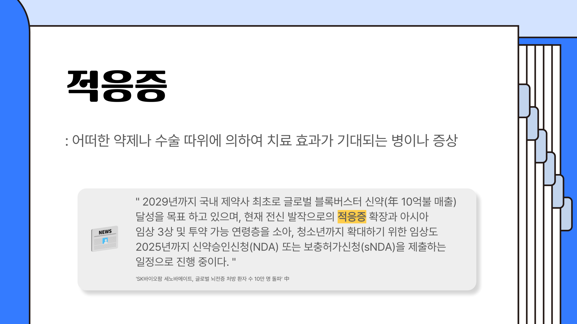 그래서 이번 콘텐츠에서는 제약바이오뉴스에서 많이 쓰이는 용어를 소개하려 합니다😊 용어만 풀이하면 이해가 어려울 수 있으니 실제 SK바이오팜 보도자료에 나온 기사 일부를 사용하여 예시를 함께 들겠습니다!