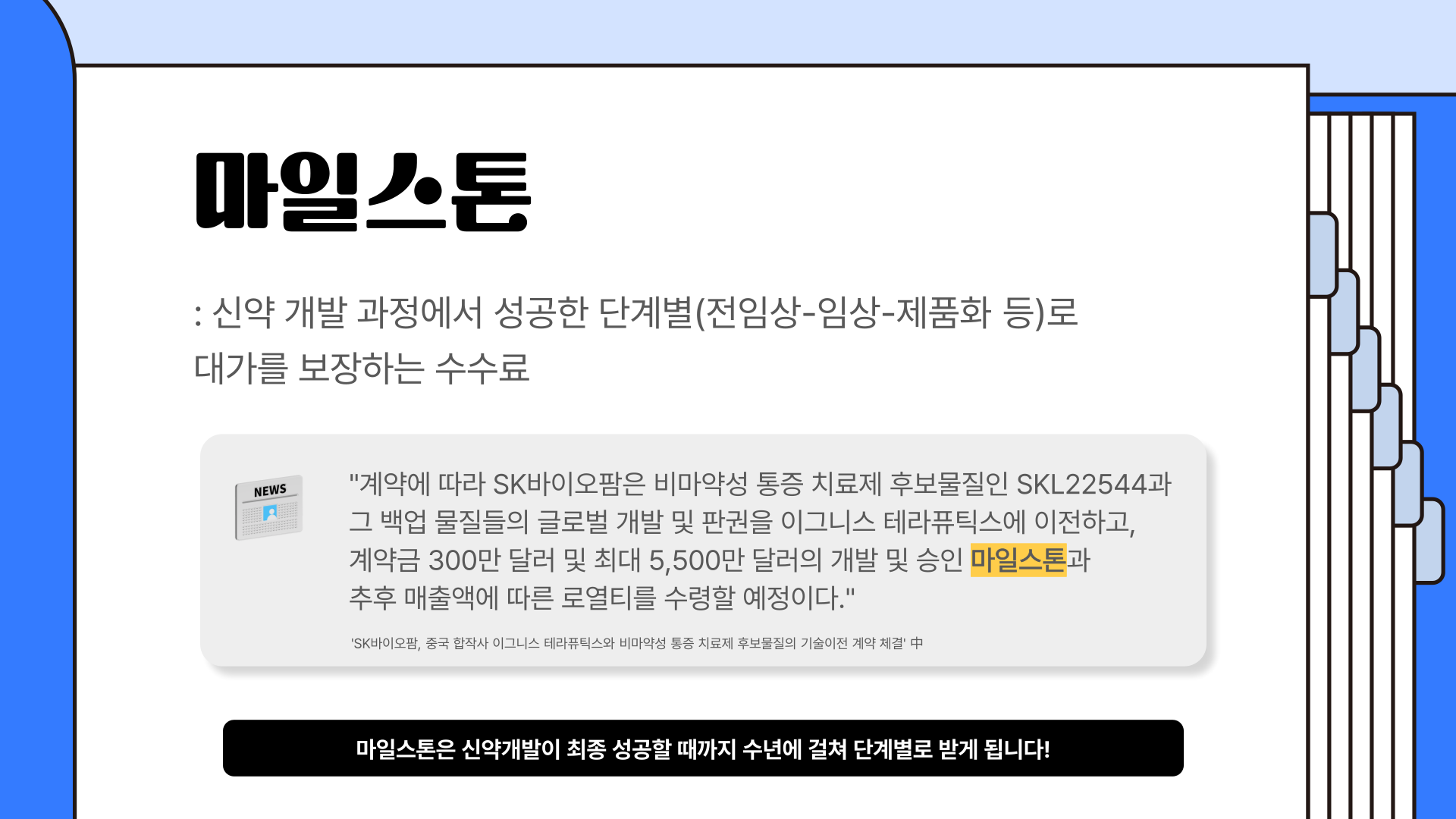 끝으로 마일스톤이란, 신약 개발 과정에서 성공한 단계별(전임상-임상-제품화 등)로 대가를 보장하는 수수료를 뜻합니다.