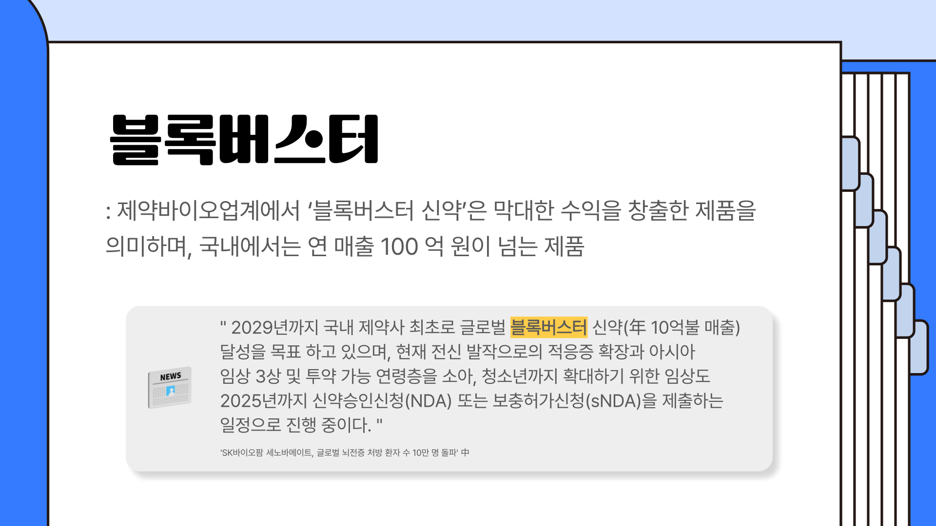 블록버스터란, 제약바이오업계에서 ‘블록버스터 신약’은 막대한 수익을 창출한 제품을 의미하며, 국내에서는 연 매출 100 억 원이 넘는 제품을 의미합니다.