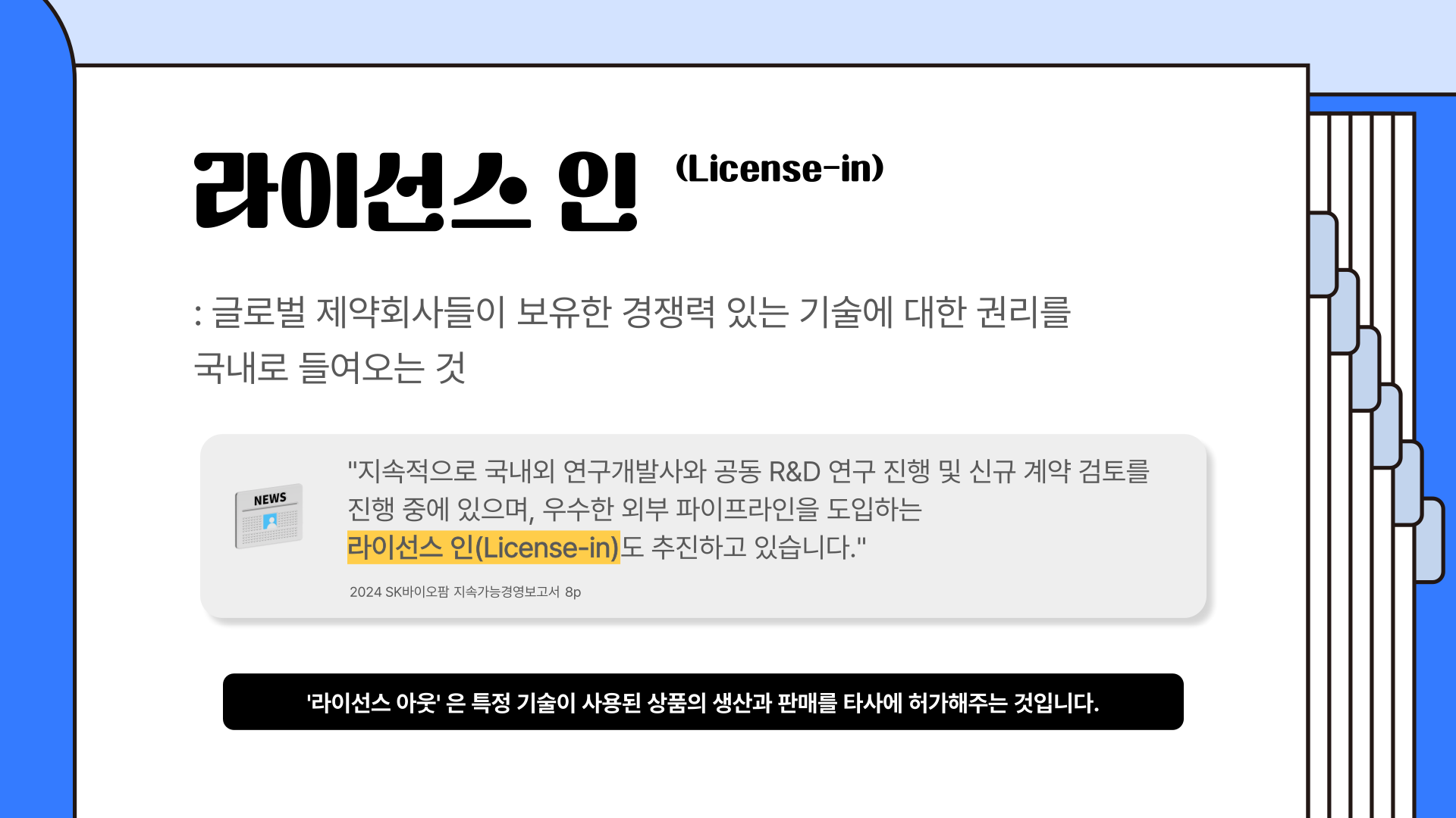 라이선스 인(License-in) 은 글로벌 제약회사들이 보유한 경쟁력 있는 기술에 대한 권리를 국내로 들여오는 것입니다.