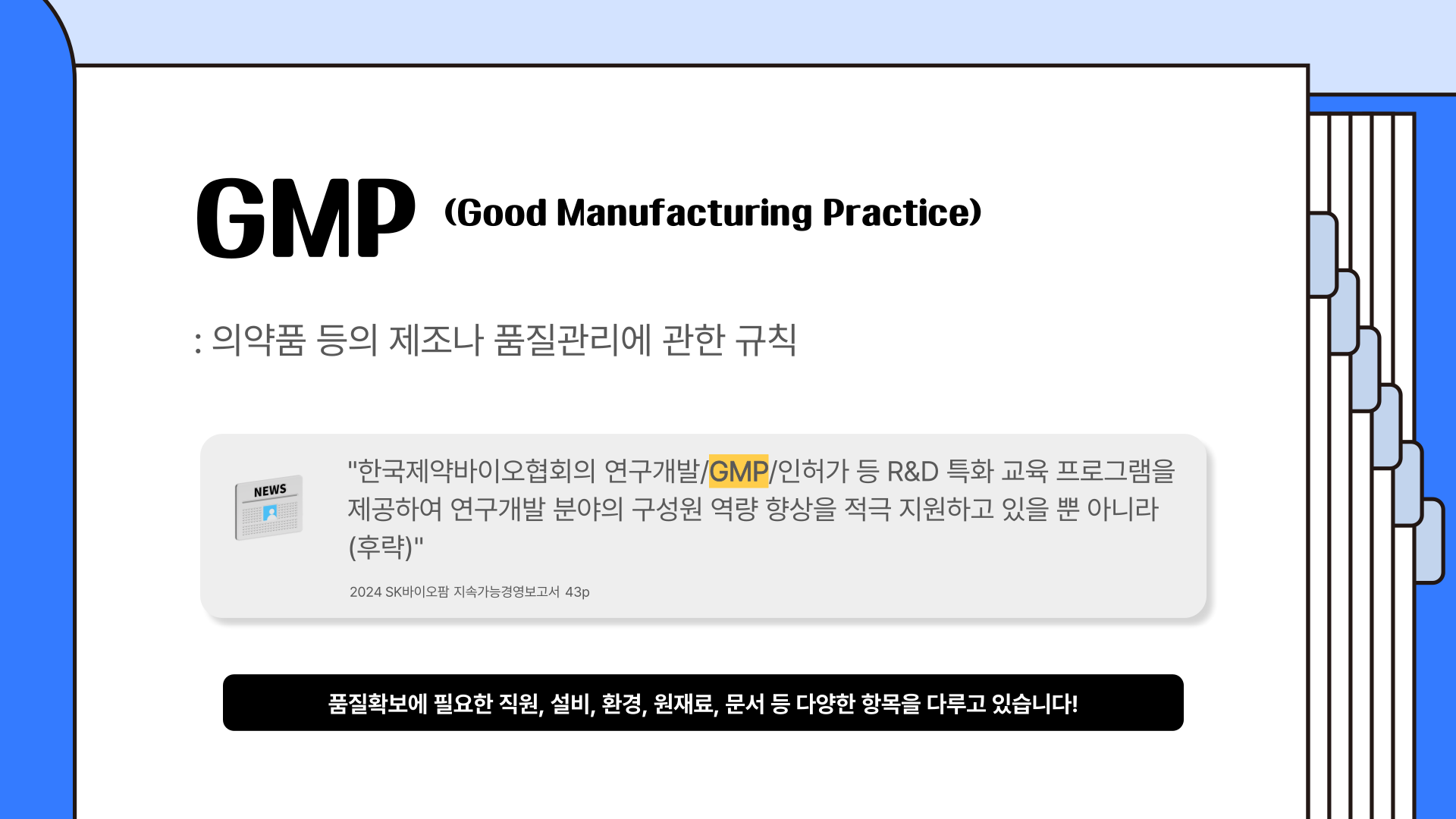 품질관리에서 매우 중요하게 여겨지는 GMP(Good Manufacturing Practice)란, 의약품 등의 제조나 품질관리에 관한 규칙인데요. 품질확보에 필요한 직원, 설비, 환경, 원재료, 문서 등 다양한 항목을 다루고 있습니다!