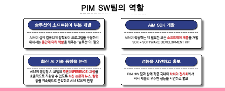AiM SDK 개발 과정에서 최신 AI 기술 동향을 분석하는 일도 저희 팀의 중요한 업무입니다. 급증하는 AI 반도체 수요에 발맞춰 AiM이 생성형 AI 모델의 추론(inference) 과정을 효율적으로 지원할 수 있도록 최신 논문과 뉴스, 칼럼 등을 지속적으로 분석하고 AiM SDK에 반영하기 위해 노력하고 있습니다. 아울러 PIM HW 팀과 함께 각종 국내외 학회와 전시회에서 자사 제품의 우수한 성능을 시연하고 홍보하는 일도 다양하게 진행 중입니다.