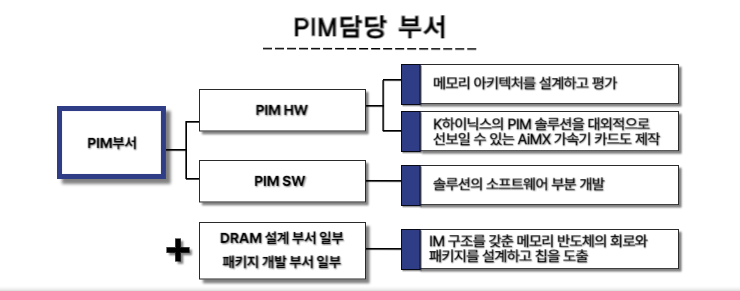 아울러 AiM 칩을 개발한 DRAM 설계 부서와 패키지 개발 부서가 있습니다. PIM 구조를 갖춘 메모리 반도체의 회로와 패키지를 설계하고 칩을 도출하기까지의 과정을 두 조직이 함께 진행했습니다. 다만 양 부서는 PIM뿐만 아니라 다양한 DRAM 반도체를 연구 및 개발한다는 점에서 PIM만을 전담하는 조직이 아니라는 차이점이 있어요.