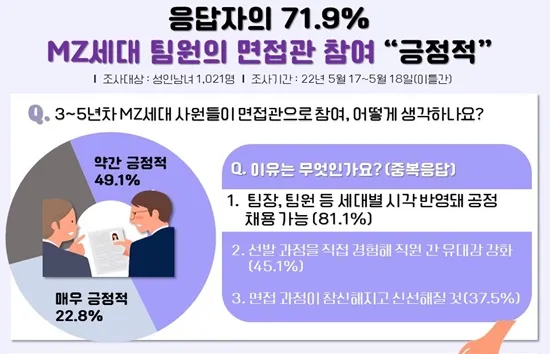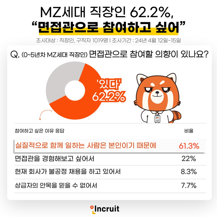 직장인 설문조사에서도 MZ 면접관 제도에 대한 인식은 긍정적으로 나타났습니다. 경력 5년 이하 면접관, 즉 MZ세대 면접관으로 참여할 의사가 있는 응답자는 62.2%로 과반수를 훌쩍 넘겼고, 직접 채용에 참여해서 함께 일할 사람을 뽑고 싶다는 게 주된 참여 이유로 뽑혔습니다.