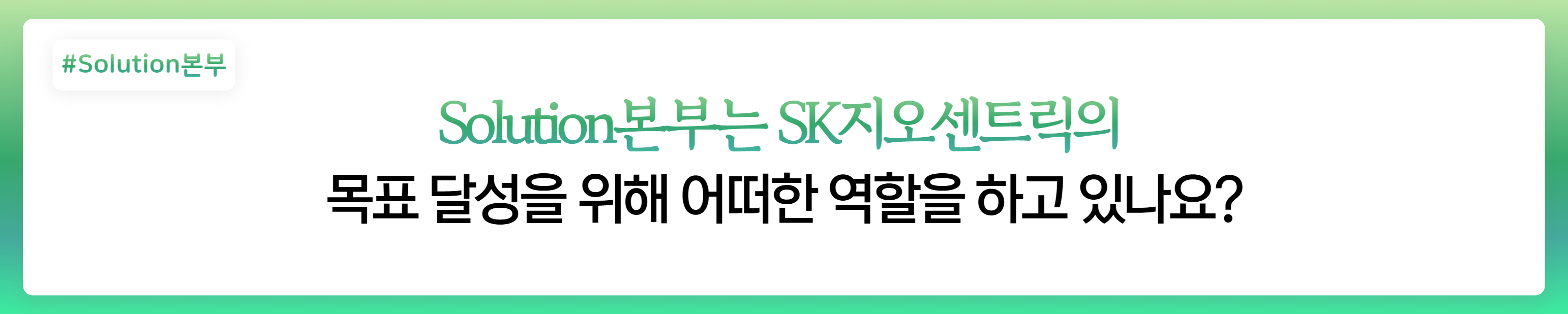 김민재 PM: SK지오센트릭은 'Green for Better Life'라는 모토 아래, 3R 솔루션(Replace/Reduce/Recycle)을 개발하고 있습니다. Solution본부는 이러한 3R 솔루션을 바탕으로 비즈니스 모델과 밸류체인을 구축하며, 이를 고객에게 제공하는 역할을 맡고 있습니다.