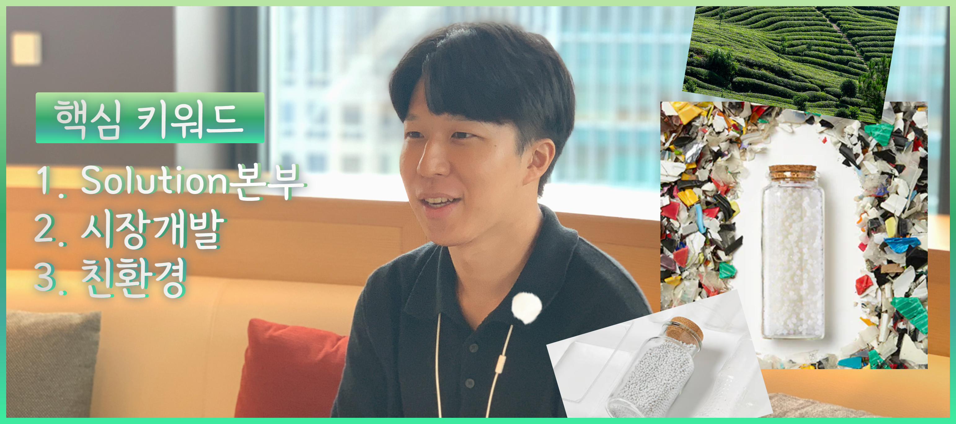 Solution본부는 세 개의 사업부로 구성되어 있으며, 각 사업부는 3R 솔루션을 다양한 제품에 적용하는 업무를 수행하는데요. 제가 속한 Packaging 사업부는 주로 폴리에틸렌(PE) 제품에 대한 3R 솔루션을 개발하고 적용하는 데 주력하고 있습니다. 특히, 저는 리사이클 부문을 담당하여 재활용 PE 제품 개발과 판매, 이를 통한 친환경 Packaging 솔루션을 고객에게 제공하고 있습니다.