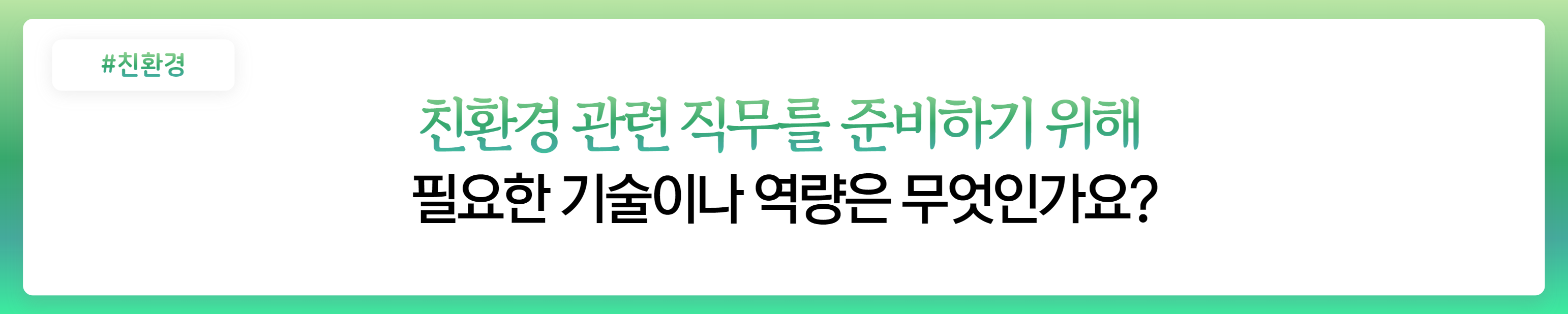 김민재 PM: 희망하는 직무에 따라 필요한 기술과 역량이 달라질 수 있는데요. 친환경 관련 직무의 경우 마케팅, 기술 개발, 탄소 배출 관리 및 관련 제도 관리 등 다양한 분야로 나누어집니다. 이를 크게 기술적인 부분과 사업적인 부분으로 나눠볼 수 있습니다.