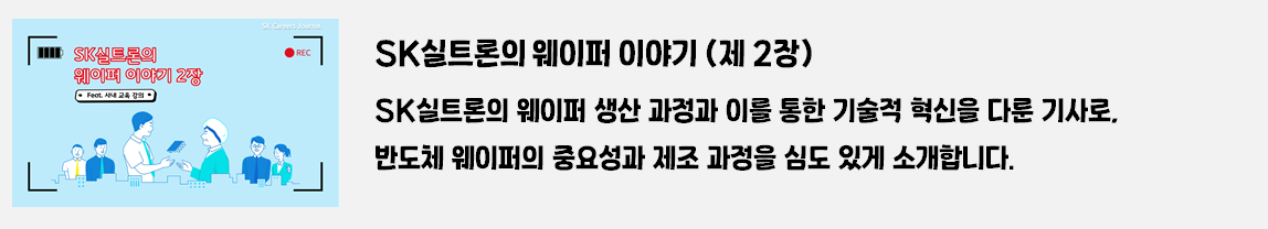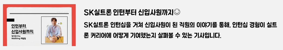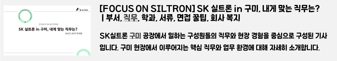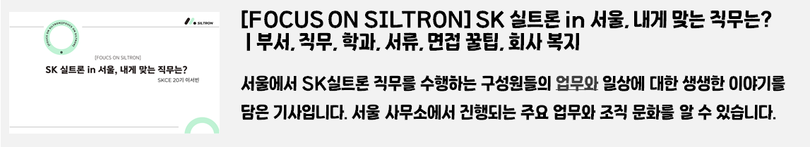 채용 정보, 직무 소개, 기업 문화, 사회공헌 활동 등 다양한 주제로 구성된 SK실트론의 이야기를 한눈에 확인할 수 있는 이번 기사! 특히, 취업 준비생과 SK실트론에 관심이 있는 모든 분들에게 유용한 정보를 제공하기 위해 기획했으니 많은 기대 부탁드립니다.지금부터, SK실트론의 매력적인 세계로 함께 떠나보실까요? ✨