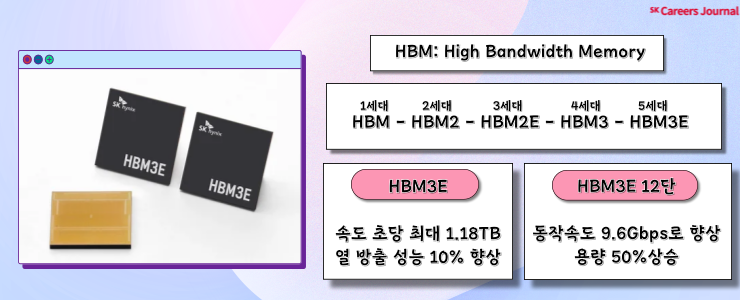 SK하이닉스는 AI메모리 반도체 분야에서 큰 활약을 하고 있는데요! 그 중 'HBM3E' 세계 최초 양산에 성공했습니다! 'HBM'이란 High Bandwidth Memory으로 여러 개의 D램을 수직으로 연결해 기존 D램보다 데이터 처리 속도를 혁신적으로 끌어올린 고부가가치, 고성능 제품인데요. 여기서 'HBM3E'는 5세대 HBM제품으로 4세대인 'HBM3'의 확장버전입니다.