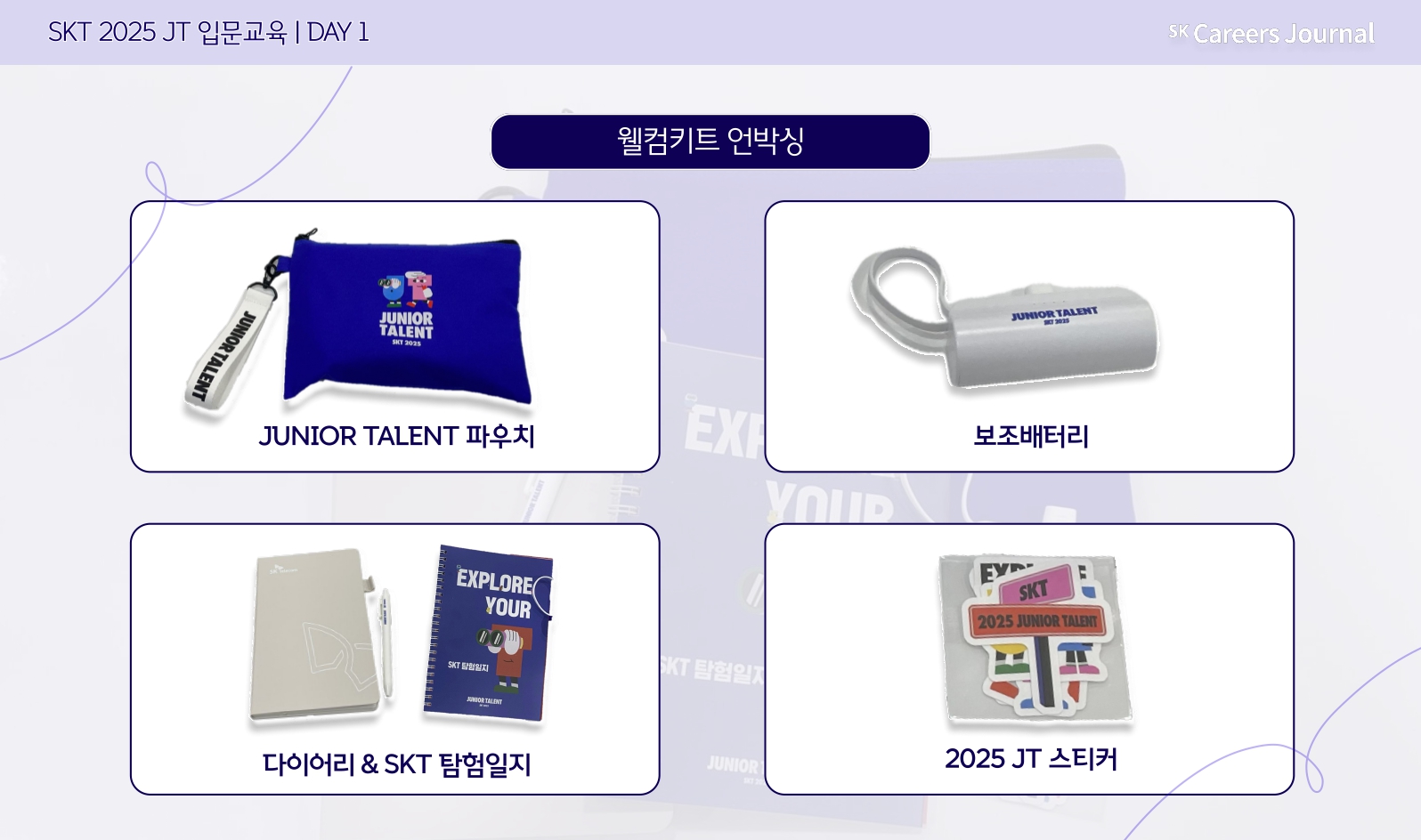 웰컴키트 안에는 신입사원들의 교육과 업무를 지원하기 위해 꼼꼼히 준비된 물품들이 담겨 있었는데요. 다이어리📔, 펜✏️, SKT 탐험일지 노트📖, 귀여운 스티커 세트🎨, 보조배터리까지🔋! 신입사원들이 앞으로의 교육과 업무를 더 즐겁고 효과적으로 진행할 수 있도록 든든한 동반자가 되어줄 웰컴 키트, 정말 알차지 않나요? 🔎