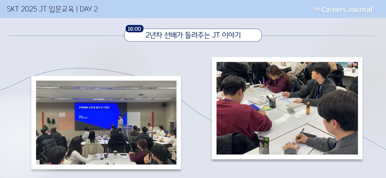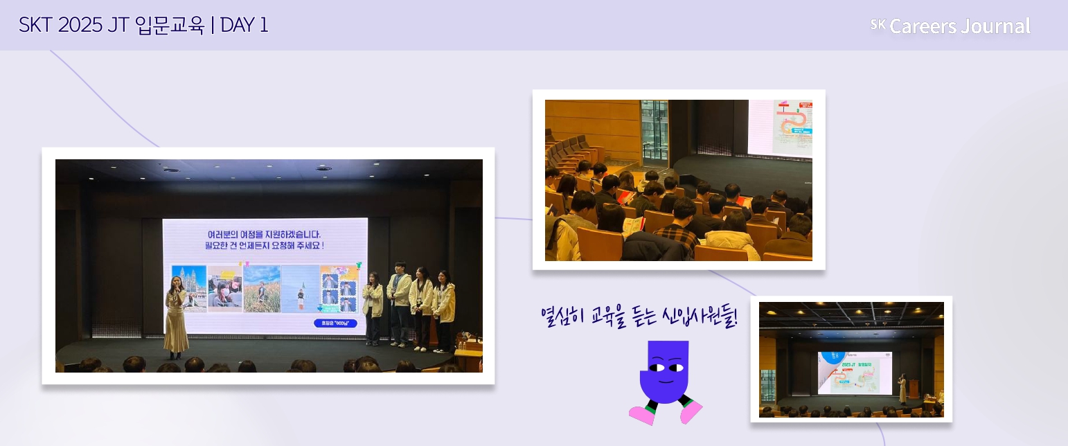 센터장님께서는 SKT의 도전적인 기업 문화를 강조하며, 따뜻한 응원의 메시지를 전해주셨습니다. 열심히 교육을 듣는 신입사원들의 뒷모습에서 새로운 여정에 대한 열정과 설렘이 느껴지지 않나요? 💪