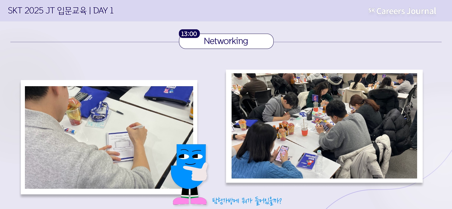 특히 눈길을 끈 것은 ‘SKT 탐험일지’라는 특별한 노트였습니다. 교육 내용을 기록하고 성장 목표를 정리할 수 있도록 구성된 이 노트는 앞으로 신입사원들의 여정을 함께할 든든한 동반자가 될 예정이라고 하네요. 📒