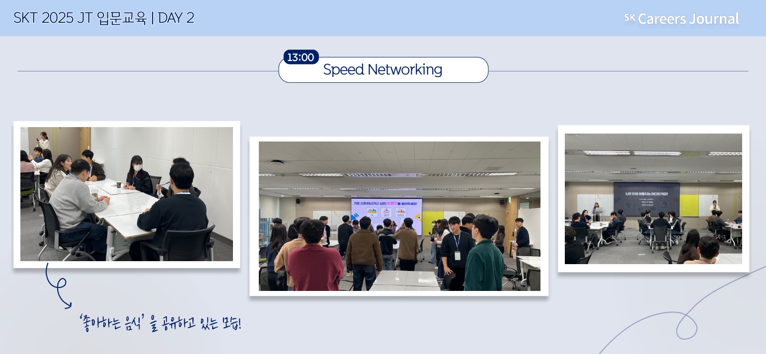 교육 둘째 날, 오전 프로그램이 끝난 후 신입사원들은 활기찬 분위기 속에서 스피드 네트워킹 시간을 가졌습니다. "선호하는 음식은?", "가고 싶은 여행지는?" 등의 질문을 주제로 그룹별로 즐겁게 대화를 나누며 서로의 취향을 공유하는 모습이 보이시나요? 짧은 시간이었지만, 서로의 취향을 공유하며 한층 가까워지는 계기가 되었을 것 같네요. 😉