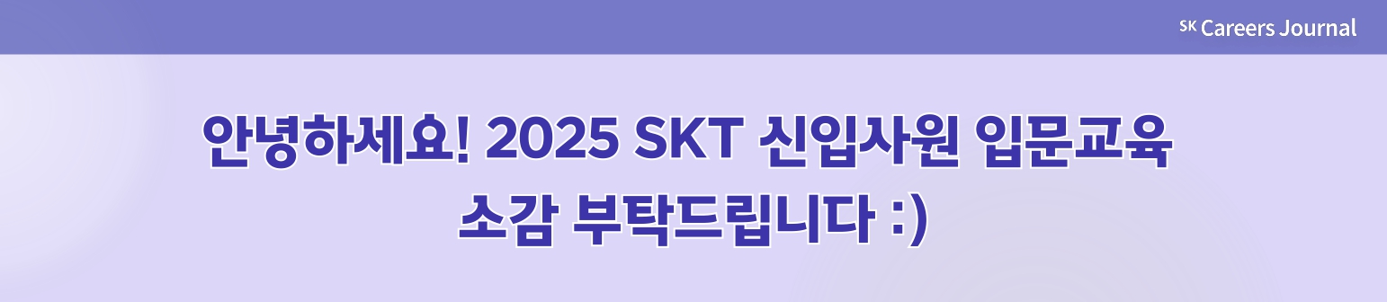 이영진:안녕하세요! 고객 직군 B2C 마케팅 직무에 합격한 이영진입니다. 이번 신입사원 교육을 통해 SK텔레콤이 추구하는 방향성과 비전을 보다 명확하게 이해할 수 있어서 정말 좋았습니다. 특히, 이전에는 접하지 못했던 실무적인 부분까지 미리 들을 수 있어 더욱 유익한 시간이었던 것 같아요!
